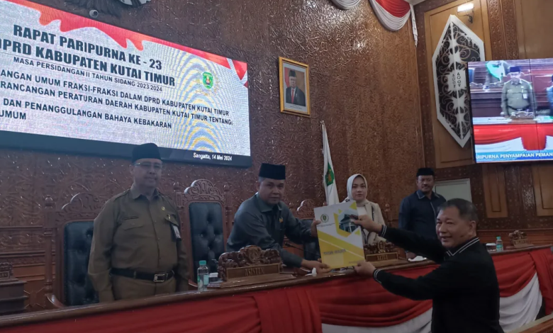 Sangatta – Dewan Perwakilan Rakyat Daerah (DPRD) Kabupaten Kutai Timur telah menggelar Rapat Paripurna Tahun 2023/2024, dalam Rapat Penyampaian Tentang Pandangan Fraksi DPRD Kabupaten Kutai Timur Terhadap Dua Rancangan Raperda Tentang Pencegahan Dan Penanggulangan Bahaya Kebakaran Dan Penyelamatan Serta Raperda Tentang Ketertiban Umum.