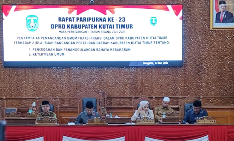 Sangatta – Dewan Perwakilan Rakyat Daerah (DPRD) Kabupaten Kutai Timur mengadakan rapat paripurna ke-23 untuk membahas pandangan umum dari tujuh fraksi terkait dua rancangan peraturan daerah (Raperda): pencegahan dan penanggulangan bahaya kebakaran serta ketertiban umum.