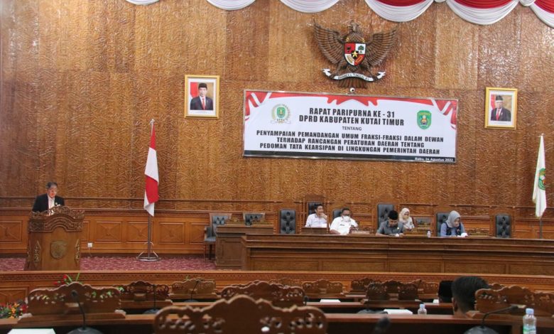 KUTAI TIMUR – DPRD Kutai Timur menggelar Rapat Paripurna ke 31 dengan agenda pandangan fraksi fraksi DPRD Kutim terkait Rancanangan Peraturan Daerah Mengenai Pedoman Tata Kearsipan di lingkungan pemerintah daerah, Rabu (24/08/2022).